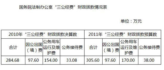 中新网7月25日电国务院法制办公室今日在其网站上公布了2010年财政拨款开支的“三公经费”支出决算和2011年预算。数据显示,2010年,法制办“三公经费”决算数为284.68万元。其中:因公出国(境)费为97.60万元,公务用车运行及维护费支出154万元,公务接待(含外事接待)33.08万元。