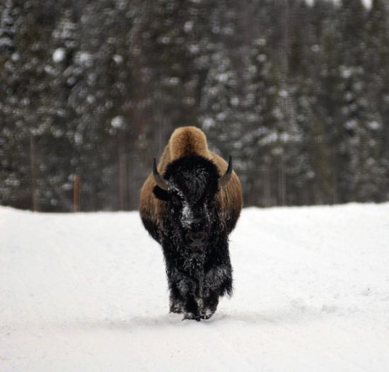 我们穿过一段两侧都是密林的道路。这片森林历经了上千年的岁月,是黄石现存最古老的森林之一。林木笔直,松枝上挂满积雪,一如世外仙境。杰夫忽然举手示意大家减速慢行。对面过来一群体格庞大的野牛,也许是没有别的选择,也许是熟视无睹,正一步步不慌不忙地逼近。黄石的野牛,是百年前西部开发时被屠杀到几近绝种的近千万匹野牛留下的一点血脉,受到非常严格的保护。杰夫带头,我们的车队保持队形,低速和野牛群对面走过。百米,十米,交错。不敢也不允许停车拍照,只在交错的瞬间按下挂在胸前的相机快门。鬃毛上挂满冰霜的野牛目光冷峻,全然无视我们的存在。也不奇怪,在黄石,它们才是真正的主人。