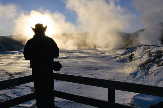 车队在黄石河畔的冰雪世界里停下,随着发动机渐次熄火,周围忽然一片寂静。有着热泉注入的河水终年不冻,弯弯曲曲地穿过雪原。野牛比人类更清楚哪里可以找到地热,能让它们在严冬里感受温暖,它们在地热蒸腾里聚集着,偶尔移动几步。阳光透过云层照亮了山根,几匹晨猎归来的灰狼不慌不忙地从林边走过,也许已经吃饱,一路碎步从野牛身边走过,消失在山脊之后。黄石的冬天,2012 年即将到来。再次跨上雪地摩托前,杰夫建议大家完全安静,不要有任何走动,不要发出任何声音,闭上眼,用耳去听,用心去感受。听见了穿过松林的风的回旋,听见了野牛踏破雪地的步伐,再静些,再静些,那怦然撞击着的,是我们自己的心跳,还是黄石大火山在地球深处的脉动?