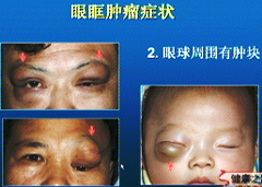 主持人:如果表面看来并不明显,长的肿瘤会很大吗? 肖利华:再来看一张图,眼球突出并不明显,但肿瘤已较大。