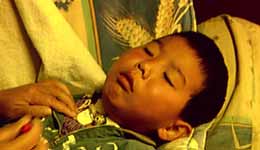 这家人究竟有什么苦衷,为什么会这样愁苦?他们的孩子得了什么怪病,怎么会连哭都哭不出声音来?这一切还要从一年半以前说起。2003年秋天的一个早晨,在云南省宜良县汤池镇的永丰营村,勤劳的村民们大多已经在地里劳动了。赵坤山和妻子赵莉也早早地起来了,由于邻居家修房子,赵坤山过去帮忙,赵莉则在家准备一家人的早饭。谁也没注意到,赵坤山5岁的儿子赵永瑞刚刚起床,见爸爸妈妈都在忙,就一个人溜出了门,自己玩去了。村子不大,没多会儿,小瑞瑞就来到了邻居赵东明家。由于瑞瑞经常来玩,大人们也没有注意他。就这样,瑞瑞一个人来到了后院,这里有他很熟悉的一个玩伴,狼狗大黑。平时瑞瑞来的时候,大黑都会撒娇地冲上去跟瑞瑞亲近,但是今天,大黑的精神好像不太对头,它远远地看着瑞瑞,眼神里透出不可捉摸的光。瑞瑞还是像往常一样走向了他的伙伴,这时,小瑞瑞并没有意识到,眼前的这条大狗,即将变成一个极其可怕的恶魔,而5岁的瑞瑞,正处在极度危险之中。