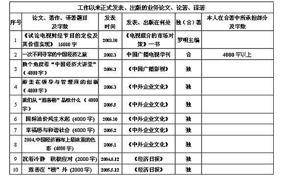 工作以来,据不完全统计,本人在中国广播电视学刊、经济日报等刊物上发表论文10篇,主编《中国市民的经济观》、《都市生活报告》、《财经震撼》、《中国经济大讲堂》以及《中国经济这六年》等书,提升了节目的影响力,《中国财经报道》也多次被台内外评为优秀财经栏目。近年来,在栏目品牌延伸方面多有建树,创办了中国财经报道论坛品牌,策划出版了“打开经济问号系列”丛书,等十余册图书。(详见附录1)