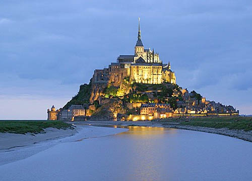圣米歇尔山,法国著名古迹和基督教圣地,位于芒什省一小岛上,距海岸两公里。小岛呈圆锥形,周长900米,由耸立的花岗石构成。海拔88米,经常被大片沙岸包围,仅涨潮时才成为岛。公元8世纪,圣米歇尔神父在岛上最高处修建一座小教堂,奉献给天使长米歇尔,成为朝圣中心,故称米歇尔山。圣米歇尔山经大自然的造化,使它本身就是世界的一大奇观,而山上的古迹修道院和大教堂则在基督教徒的心目中有着至高无上的地位。